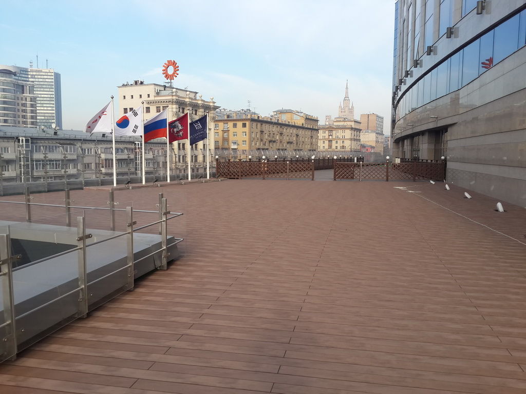 Для ее обустройства использовались регулируемые опоры NewMaxi, лаги из ДПК, доска террасная WOOZEN для финишной отделки крыши. Отличительной особенностью террасных досок является возможность укладки ее под разными направлениями для преломления лучей света и создания на эксплуатируемой поверхности стильного, оригинального узора.